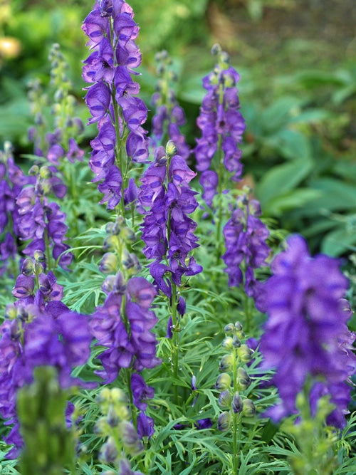 Blue flowers May-Jul, lovely soft winter foliage Feb onwards,60cm. Easy, tolerant of dry shade under trees. British native - monkshood.