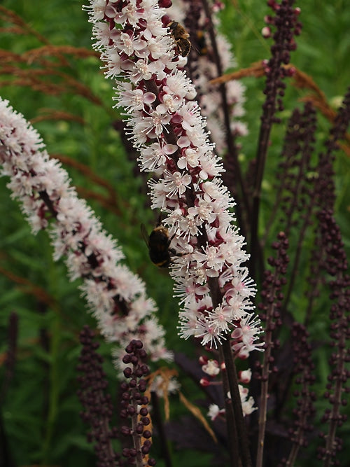 Actaea simplex 'Brunette' is a dramatic perennial known for its deeply coloured black-purple leaves and tall spikes of fragrant white flowers that appear from July to September.