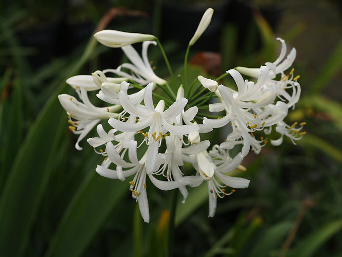 Good full heads of white flowers each flower almost as big as nerine floret Aug-Oct, 60cm. Precocious.