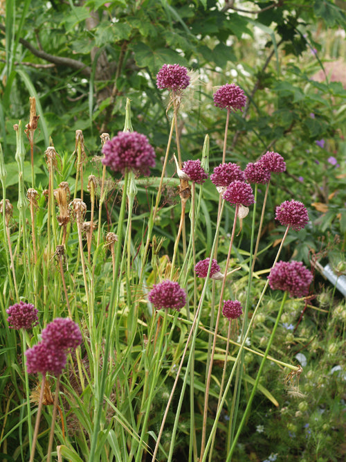 Spherical heads of deep maroon-purple Jun-Aug preceded by dramatic pixie hats, blue-green winter foliage, clumping, 1m.