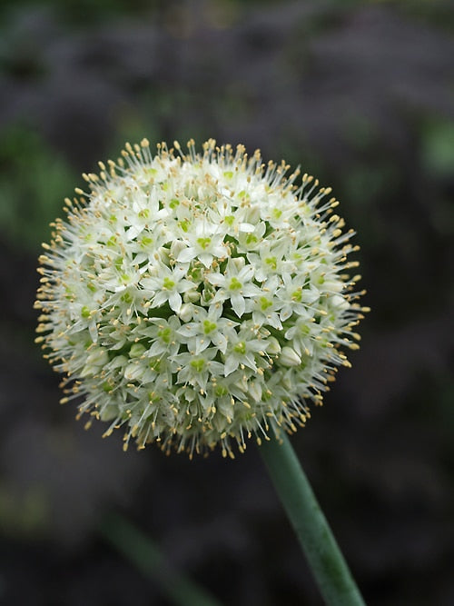 Round heads of green-white flowers Jun-Aug, pneumatic grey stems, 85cm. Originally collected Uzbekistan, Pskem range, Akbulak valley by Jim Archibald. Similar to A.cepa 'Kew White' but not the same.