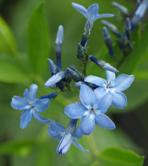Amsonia 'Blue Ice' is a compact, shapely perennial reaching 35cm in height, known for its sky-blue flowers that emerge from black to slate-blue buds from May to July.