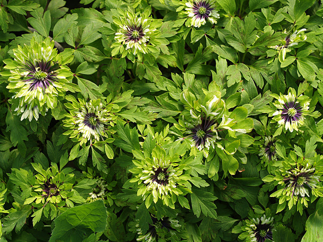 Started as 'Westwell Pink'. Violet-black centred green and white foliose flowers Apr-May, 12cm.