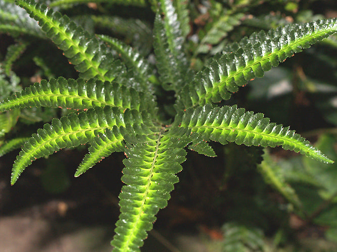 Smart leathery dark green evergreen fern fronds with paler yellow-green middles, 45cm. From China and Japan.