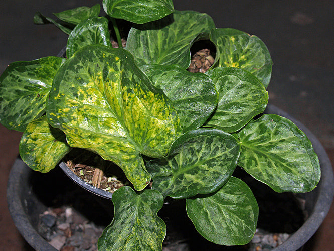 Ultimately from Nancy Lindsay vis David Bromley. Yellow marked patterned leaves Sep-Jun, 25cm. The yellow colouring develops as the leaves mature.