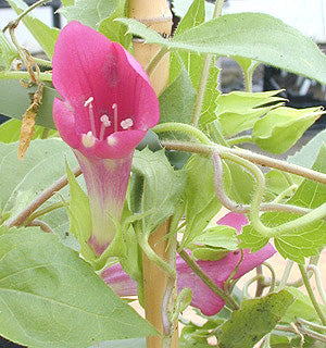 Large wine-coloured trumpets, grey-green foliage, procumbent.