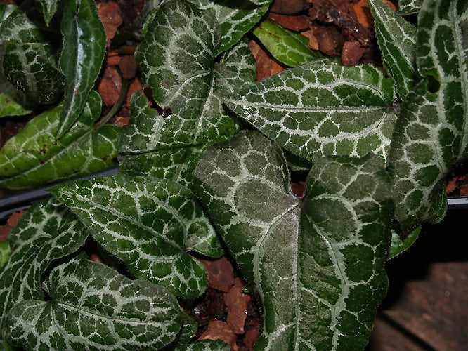Superbly pale patterned deep green evergreen foliage, brown and white flowers Mar-May, 15cm. Deep shade. Synonym A.epigynum 'Silver Web'.