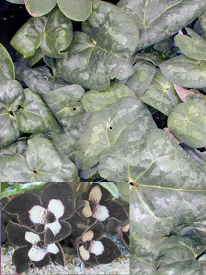 Large evergreen silver-marked foliage, prolific clusters of large white-eyed black trilobed flowers Feb-Jun, 25cm. Easy in shade or keep as a magnificent pot plant. Drama incarnate.