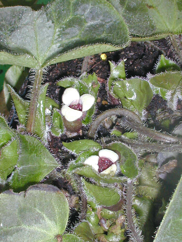 Large softly-hairy pewter-marked dark green evergreen foliage, tiny pale hairy flowers look up from ground level Feb-May, 20cm. Shade.