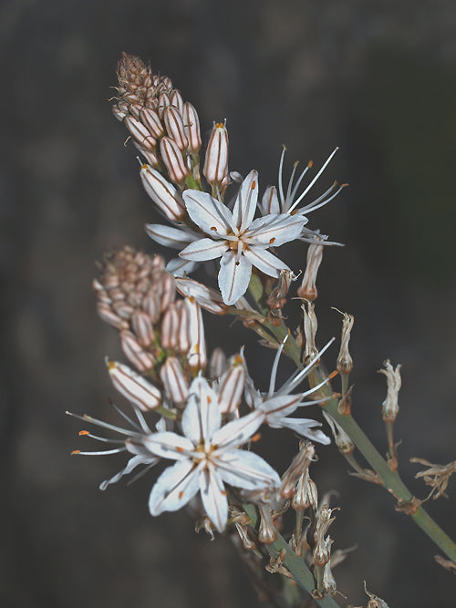 Candelabra-branched inflorescence of 2cm.wide pretty brown-striped white flowers May-Jun and sometimes Aug-Oct, 1.5m. Easy. Mediterranean inc.N.Africa. Synonym A.cerasiferus.
