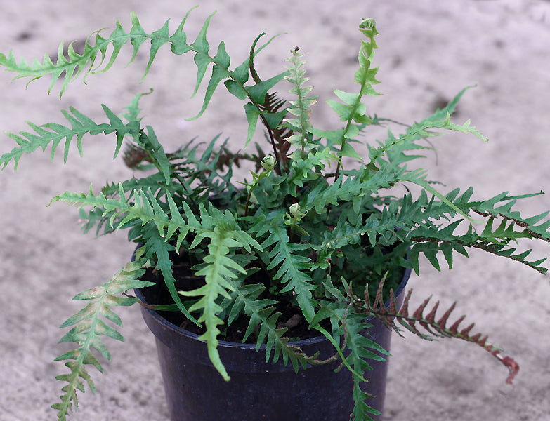 An early (1902) hybrid between Asplenium platyneuron and A.rhizophyllum (giving the highly tapered fronds) from Eastern USA. tapered pinnatifid evergreen foliage, 25cm.