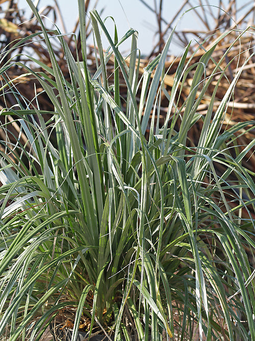 Small clumps of narrow swept shining silver evergreen leaves, 70cm.