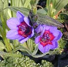 Heads of intense blue flowers with improbable red centres Apr-Jun, 20cm. Easy.