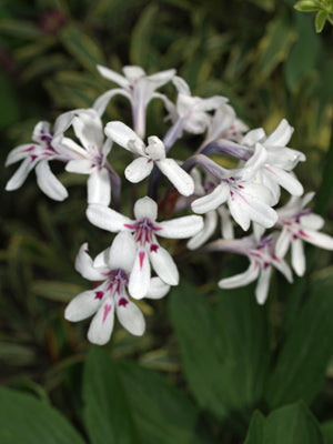 Clusters of white or cream flowers marked with red on lower lobes well-held on stout stems Mar-Apr, 40cm.