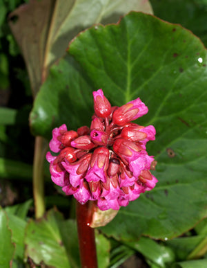 Large deep red winter foliage, heads of magenta-pink flowers Mar-May, 45cm. Eric Smith.