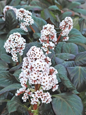 Neat glossy red-flushed winter foliage, massive heads of lovely cherubic pale sugar-pink flowers mature WHITE, red calyces (which start white) develops into distinctive statice-like heads Mar-May, 40cm.