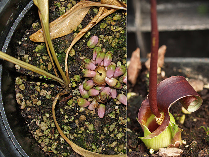 Dark purple spathes 20cm high sit on the ground Sep-Oct, clusters of green-tipped pink berries in spring, clusters of long dark green leaves straight from the ground. Collected Tajerouine, Tunisia.