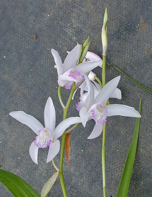 Pale pink almost white orchid flowers May-Jun 50cm. Hardy but always flowers better in a pot. Shade. Often called B.striata 'Alba'.
