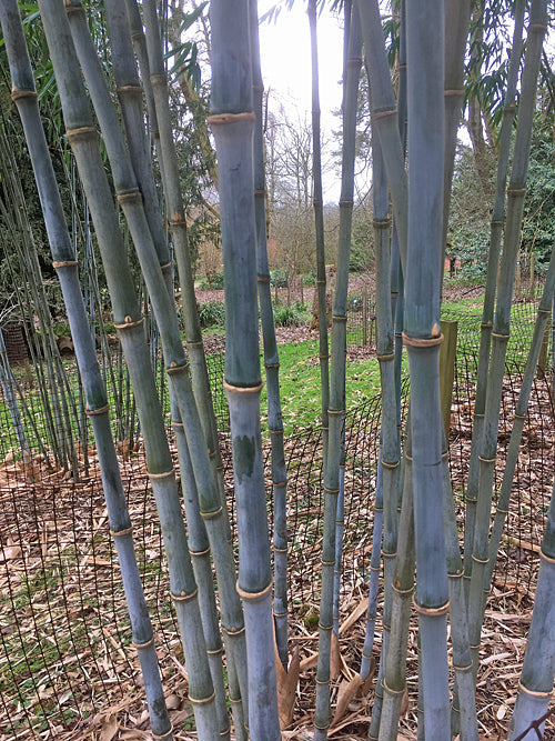 An evergreen tight clumping bamboo with delightful grey-green and blue-green culms, 3-5m.or more. Yunnan.