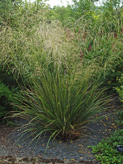 Large coarse-leaved evergreen grass, 1m, airy tan flowers 2m, early (May-Sep). As good as Stipa gigantea but smaller and less fragile. Nice.