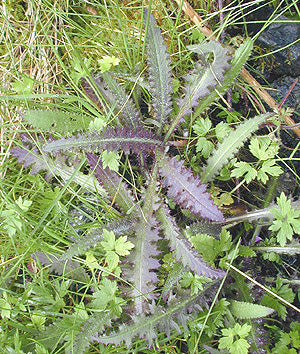 Dark, almost black prickly foliage, multiple heads of medium-sized purple thistle flowers Jun-Aug, 65cm.