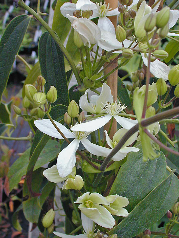Seed grown plants. White or pink-flushed scented flowers in bunches Feb-Apr, lovely 3-nerved evergreen foliage in threes, climber to 10m or more.