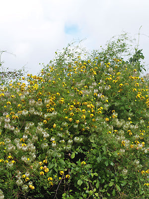 Large starry yellow flowers with dark stamens Jun-Oct, climber to 5m, vigorous.