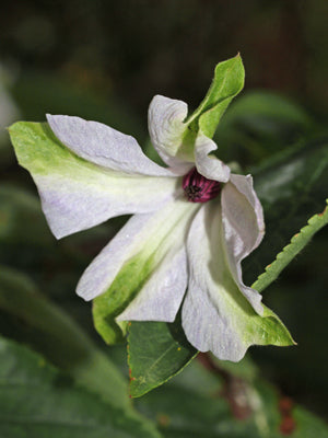 Open nodding 3 inch wide white and green flowers with black anthers Jul-Sep, 3m.