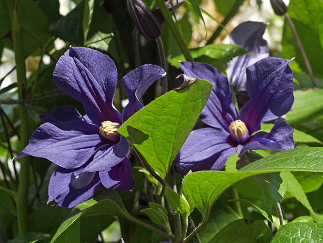 Large indigo flowers over a long season Jun-Oct on a floppy herbaceous perennial, 1-1.6m if supported. Sun, good soil. Let it flop over silver foliaged artemisia but site away from paths. (C.integrifolia x C.'Jackmannii'.)