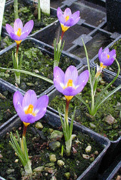 Sturdy strong purple, white and yellow flowers Feb-Mar, 10cm. Not robust outside.