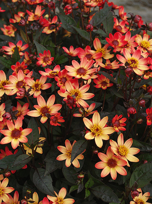 Compact plant 35cm (suitable for pots or bedding). Lots of small single dusty red and apricot flowers and black foliage. Fab!
