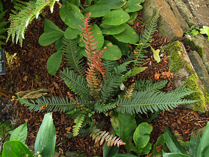 Neat tufts of pinnate evergreen fronds. New fronds are strikingly red. 20cm. NZ and Australia.