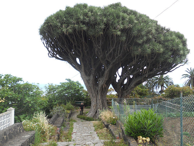 Dragon tree. Shapely architectural slow growing tree (1m.in 10 years) eventually forming multiple trunks coalesced into one, evergreen sword-shaped foliage. Canaries, Madiera, Azores, Cape Verde Islands, Morocco.