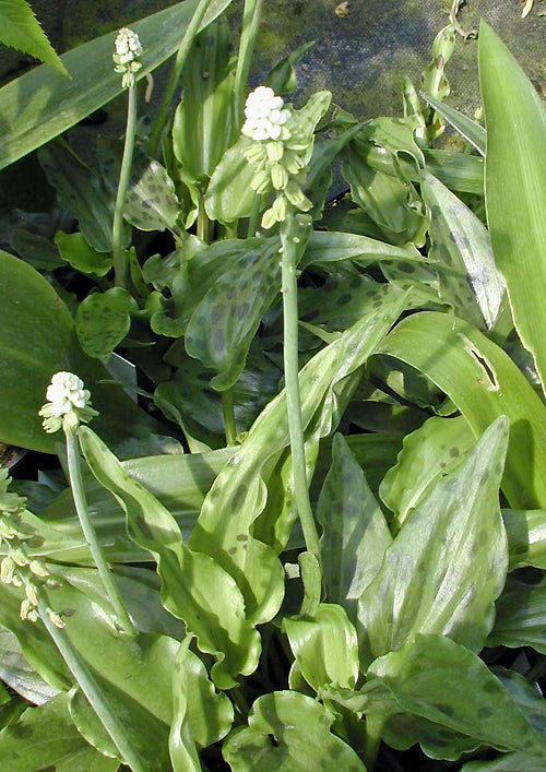 Dense muscari-like spikes of green flowers topped by white sterile flowers May-Aug, attractive thick, blotched oval basal foliage, herbaceous, 15cm. Frost hardy. Dry shade.