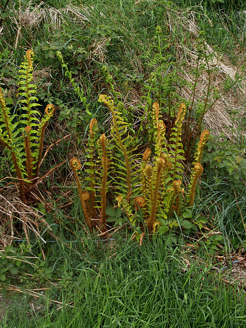 Semi-evergreen bipinnate fronds in rosettes golden-green with rusty rhachises in spring, 75cm.
