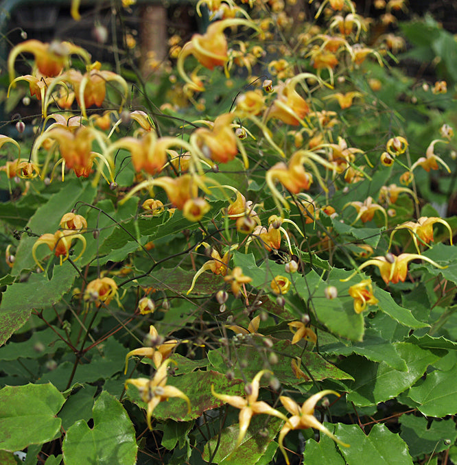 Arching heads of large bright yellow flowers enhanced with orange nectar guides held over the red-mottled evergreen foliage overwinter FOR A LONG PERIOD Sep-Jun, 55cm. Wonderful. One of Robin White's hybrids. PVR - propagation for resale prohibited.
