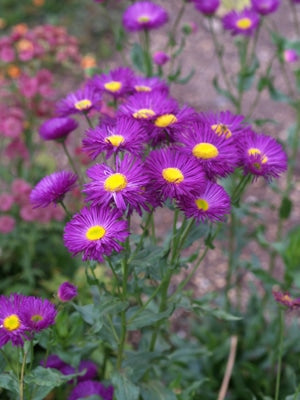 Large, tall (and self-supporting), strongly-coloured violet-purple daisy flowers Jun-Jul and Sep-Nov, 65cm.
