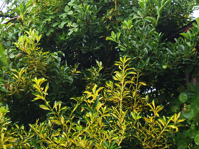 Shrub with shining evergreen yellow-variegated leaves. Can be kept low in a border for winter colour. Easy. Good for picking. Reverts.