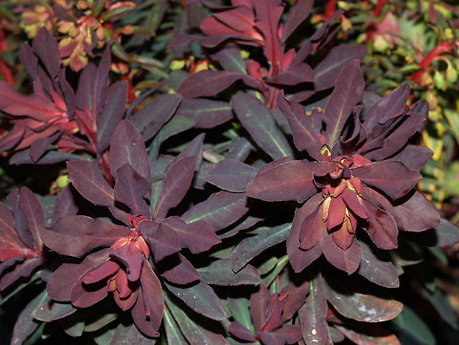Red-green winter foliage, yellow-green flower heads Mar-May, 30cm. Reckoned by Don Witton (British National Collection Holder of Euphorbia) to be the best form but it still gets mildew in summer. From the garden of the same name in Scotland.