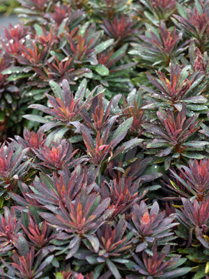 Lovely matt deep red-black foliage especially Aug-Feb, red-flushed greeny-yellow flowers from red stems Feb-May, 50cm. Easy. PVR - propagation for resale prohibited. A TC mutation from E.'Redwing'.