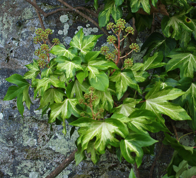 Cream variegated leaves all year, striking creamy flowers Nov-Jan, lax shrub to 1m. Good cut foliage and flower.
