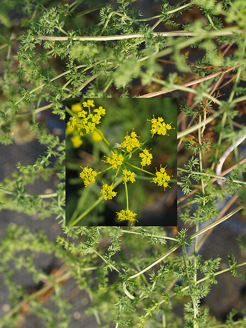 Bi-tripinnate grey-green foliage, the second and third pinnae clustered like asparagus foliage. (Was Unknown Apiaceae No.16.) Complex heads of yellow flowers autumn, winter and spring Southern and SE Turkey.