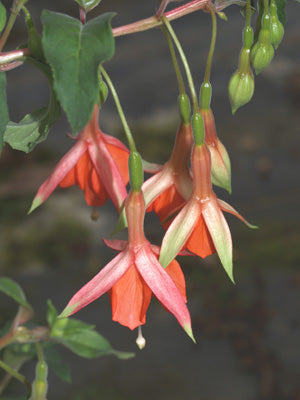 A hybrid tangerine fuchsia (several are species). paleish orange-red corolla tube with red and green outside segments. Reckoned hardy but late to regrow after a tough winter.