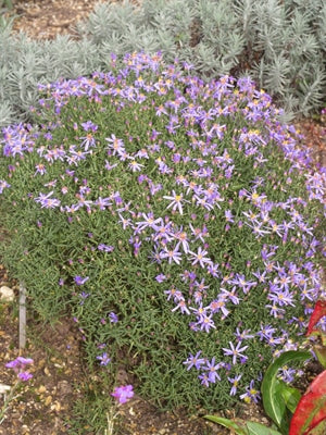 Clouds of delicate pale butterfly-like lilac-blue flowers Aug-Oct, cushions less than 35cm.high. Synonym Aster sedifolius 'Nanus'.