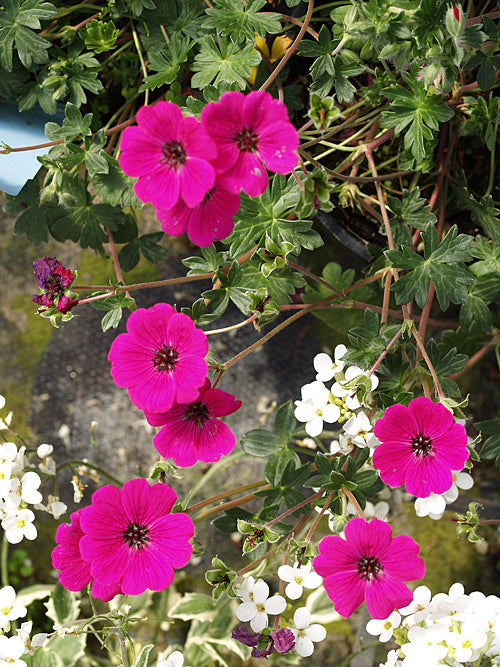 Deep startling magenta-red flowers Apr-Jul, 25cm.