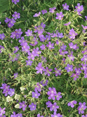 Lots of large starry deep violet-purple flowers May-Jun (and later?), feathery leaves gold when young, 40 x 50cm. Easy. G.collinum x G.Kashmir Purple.