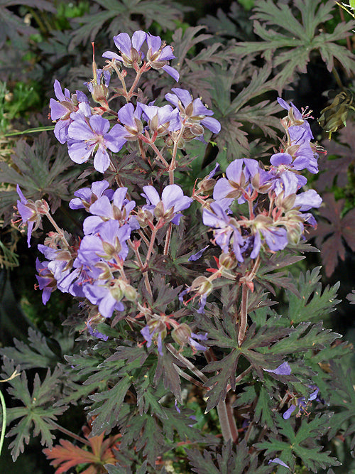 Deep red leaves (black-red when young) and violet flowers Jun-Jul and later, 55cm. A lovely form of our native meadow cranesbill imported back from USA.