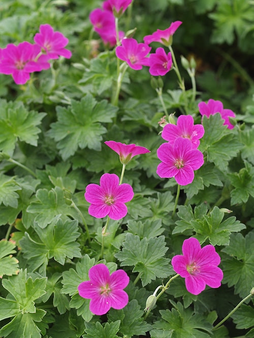 Magenta flowers over a long season May-Nov, scandent, 45cm. Well drained soil, sun. Hardy but hates winter in unimproved clay.
