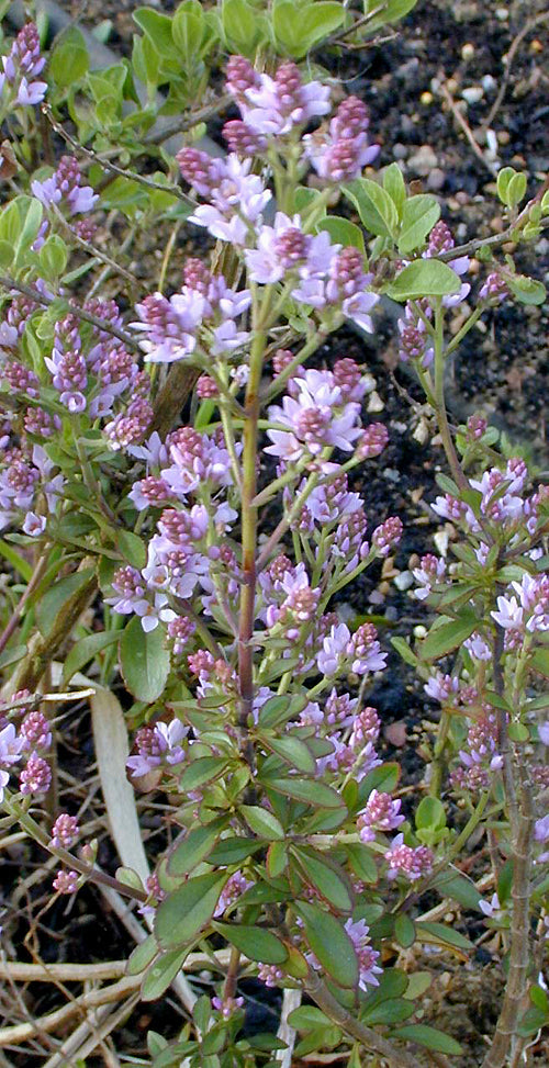 Pretty strong mauve-pink spaced out flowers Apr-Jun and later, 40cm. Easy. Quite a good plant (but lax) - most unlike a hebe.