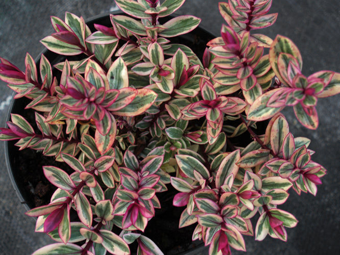 Delightful dwarf pink and cream evergreen foliage, violet flowers Jul-Aug, 50cm.